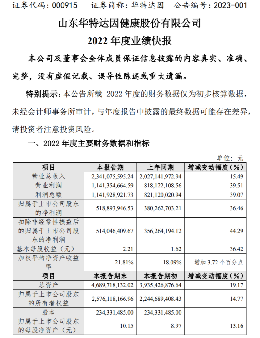 挖贝网1月19日,华特达因(000915)发布2022年度业绩快报,公告显示,2022年度营业总收入2,341,075,595.24元,比上年同期增长15.49%;归属于上市公司股东的净利润518,893,946.53元,比上年同期增长36.46%。